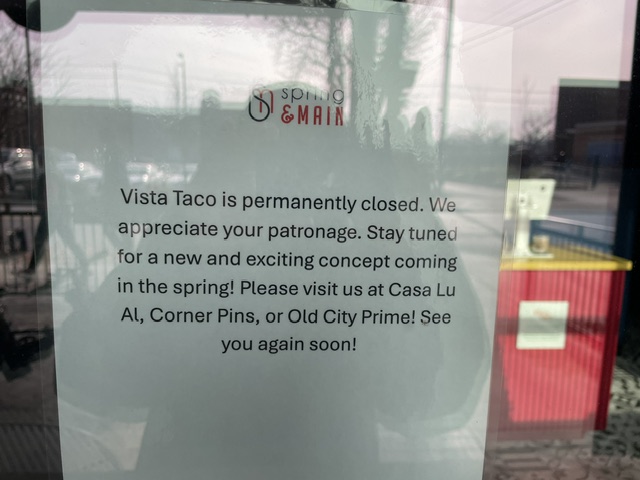 Vista Taco, the modern taco restaurant that helped anchor the recently renovated Spring & Main corridor in downtown Lima, has permanently closed. A printed notice taped to the front door announces the closure and tells customers to “stay tuned for a new and exciting concept coming in the spring,” while directing diners to Casa Lu Al, Corner Pins, and Old City Prime.